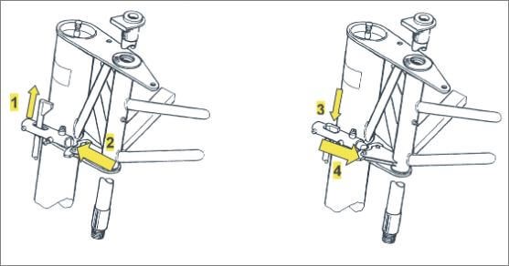 1/ Durant la prévol, s’assurer que la fourche de traction fait bien pivoter la jambe du train avant à gauche et à droite et qu’elle n’a pas tendance à se verrouiller,